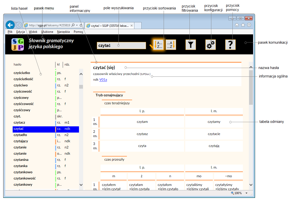 Strona WWW internetowej wersji Słownika gramatycznego języka polskiego dzieli się na trzy zasadnicze części. Górną część stanowi pasek narzędziowy, pod którym w lewej części ekranu znajduje się panel listy haseł, a w prawej — panel artykułu hasłowego.