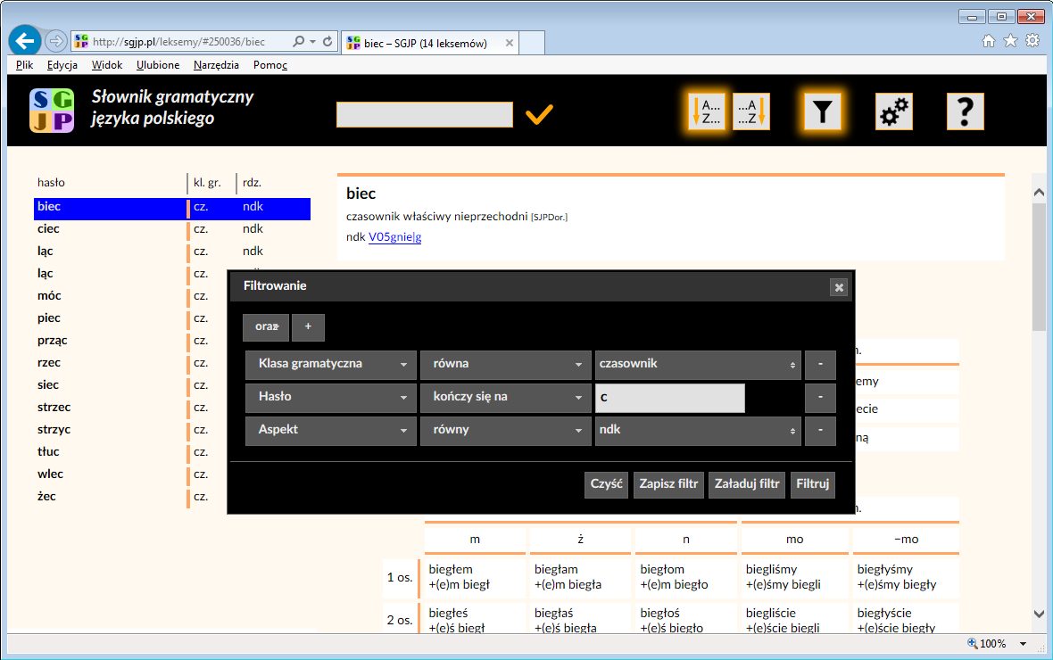 Zawartość listy wzorów, podobnie jak listy leksemów, można dostosować do swych potrzeb za pomocą filtru. Podobnie można łączyć kryteria filtrowania (alternatywnie lub koniunkcyjnie) oraz tworzyć alternatywy wartości w wypadku kryteriów zamkniętych.