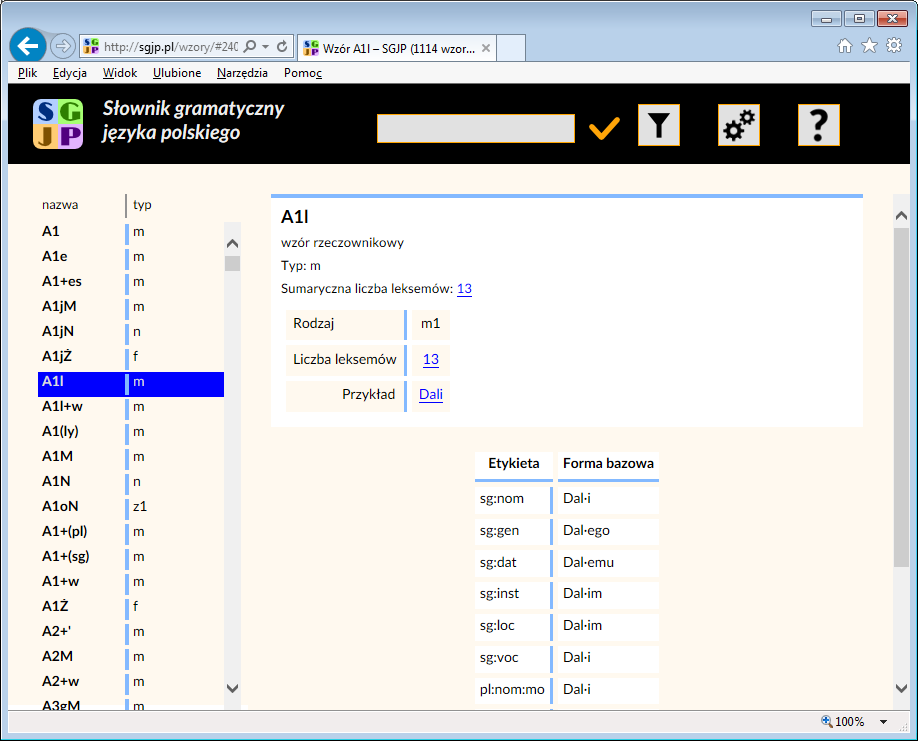 Natomiast kliknięcie w nazwę danego wzoru powoduje wyświetlenie informacji o tym wzorze — następuje przy tym zmiana widoku ogólnego na wzory fleksyjne.